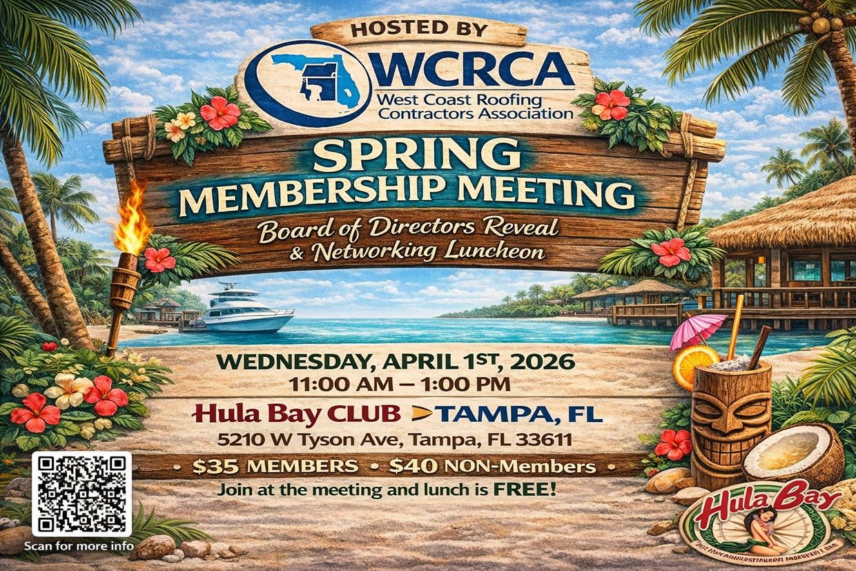 Join WCRCA for our Spring Membership Meeting at the beautiful Hula Bay Club in Tampa. This event brings together roofing professionals from across Florida’s west coast for an afternoon of networking, industry updates, and community connection.